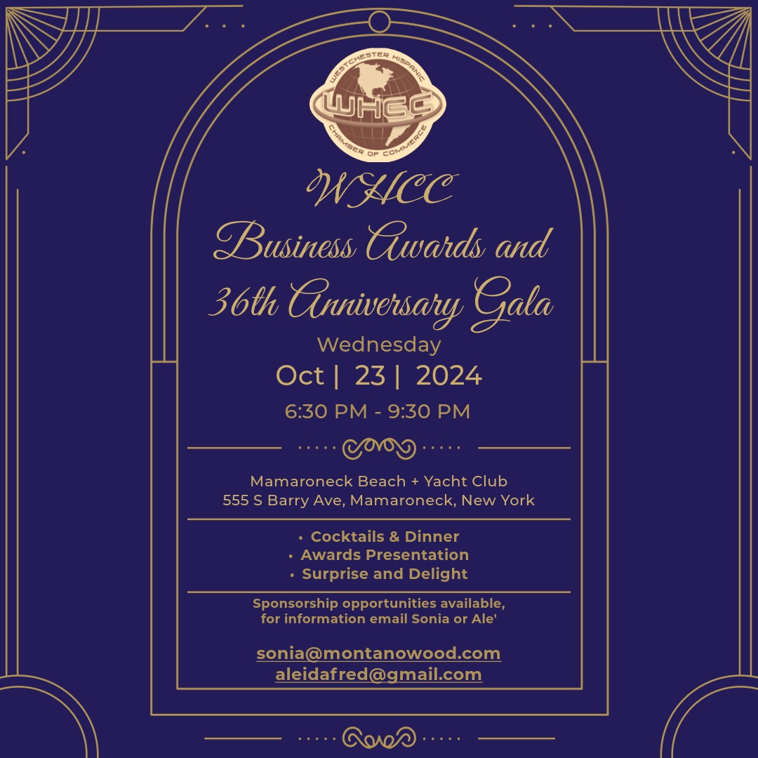 Mark your calendars for a spectacular celebration as we honor excellence in our business community at the Westchester Hispanic Chamber of Commerce Business Awards and our 36th Anniversary Gala! On Wednesday, October 23, 2024, we invite you to the beautiful Mamaroneck Beach and Yacht Club for an evening filled with inspiration, recognition, and joy. Enjoy an exquisite cocktail reception, a delectable dinner, and a special awards presentation honoring outstanding contributions to our community. Expect surprises and delights throughout the evening as we come together to celebrate our achievements and the vibrant spirit of Westchester’s Hispanic business community. We can’t wait to celebrate with you!